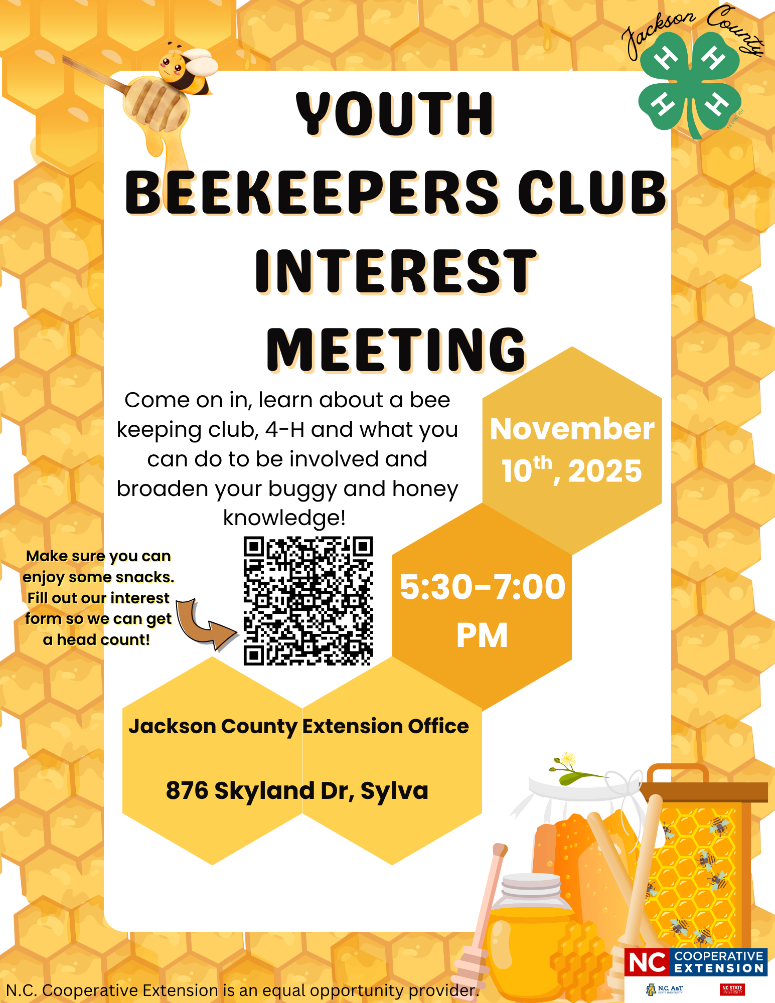 Come to the Beekeeper Club interest night on November 10th, 2025 from 5:30-7:00 at the Jackson County Cooperative Extension Office (876 Skyland Dr, Sylva).
