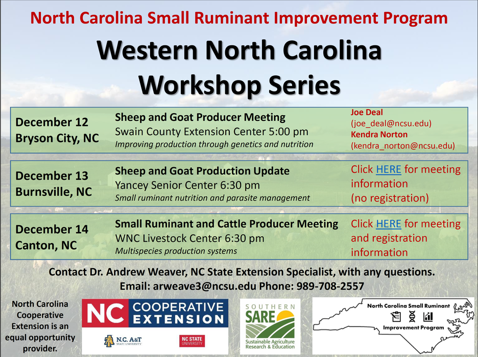 WNC Livestock Center – 6:30 p.m. Multispecies production systemsContact Dr. Andrew Weaver, NC State Extension Specialist, with any questions. Email: arweave3@ncsu.edu Phone: 989-708-2557